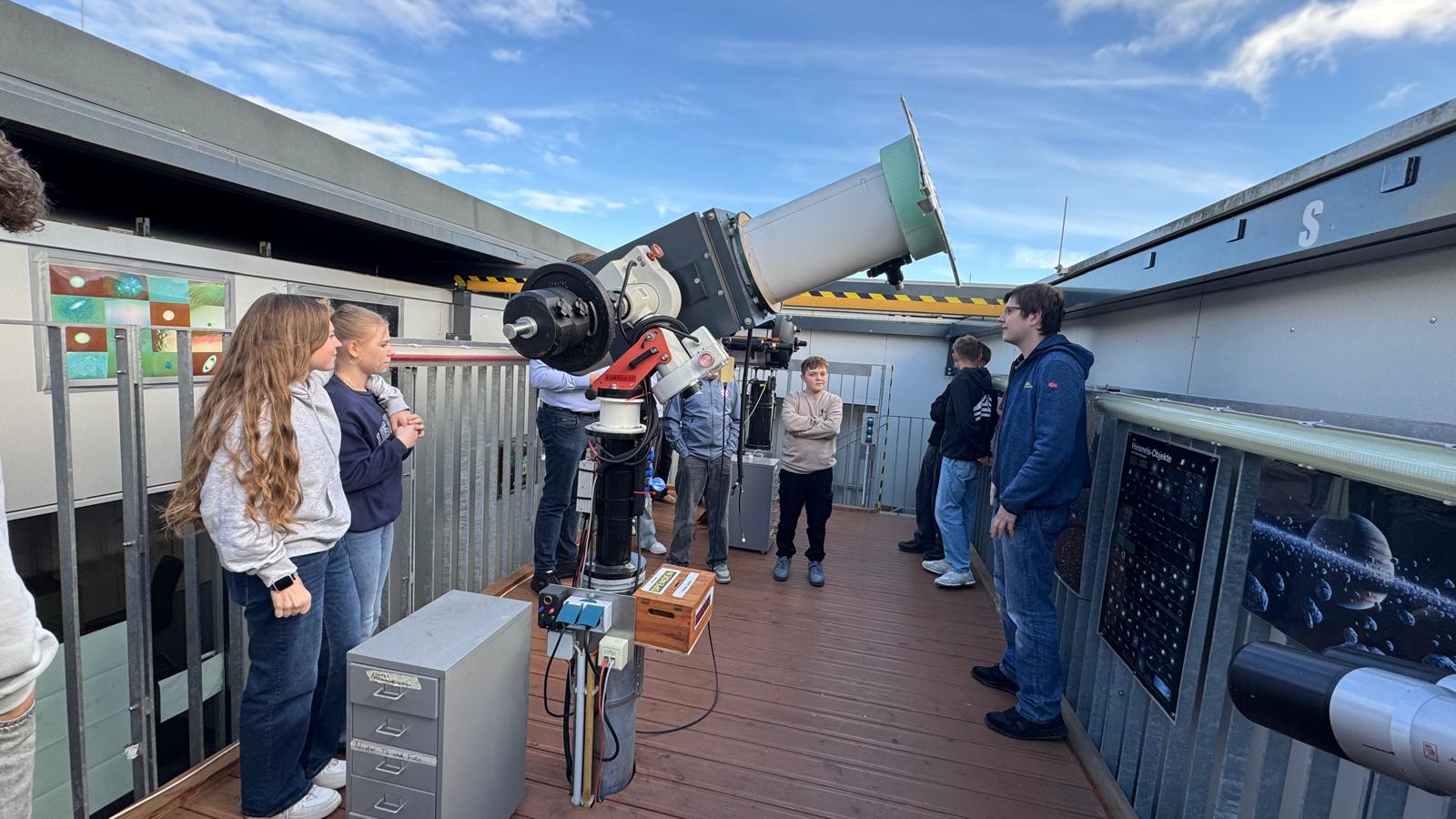 Die Gruppe besuchte die Labore, Werkstätten und Arbeitsbereiche, in denen sonst geforscht, entwickelt und experimentiert wird. Auf der Dachterrasse der Sternwarte war strahlendes Wetter und wir konnten durch das große Teleskop sogar die Sonne beobachten.