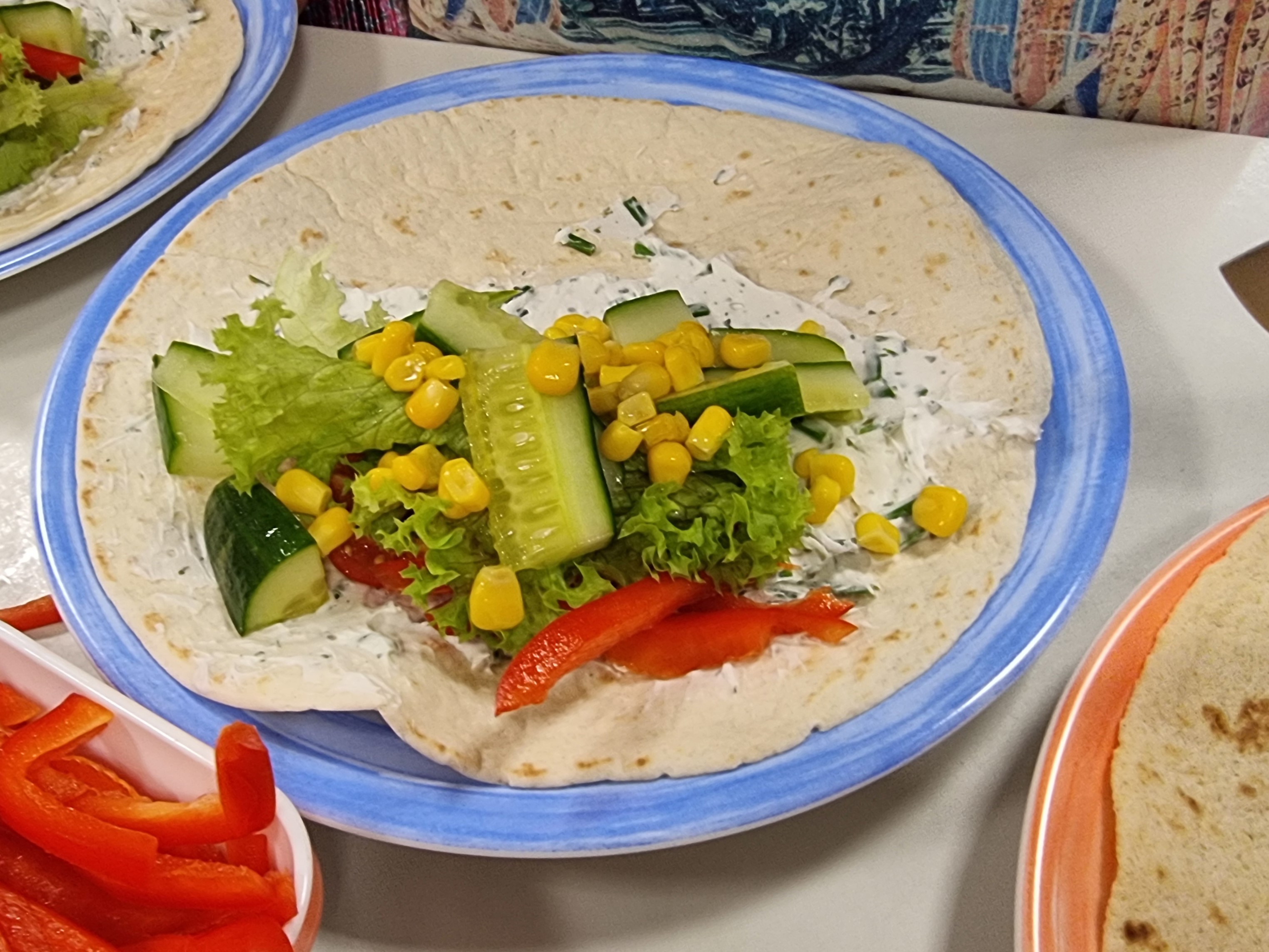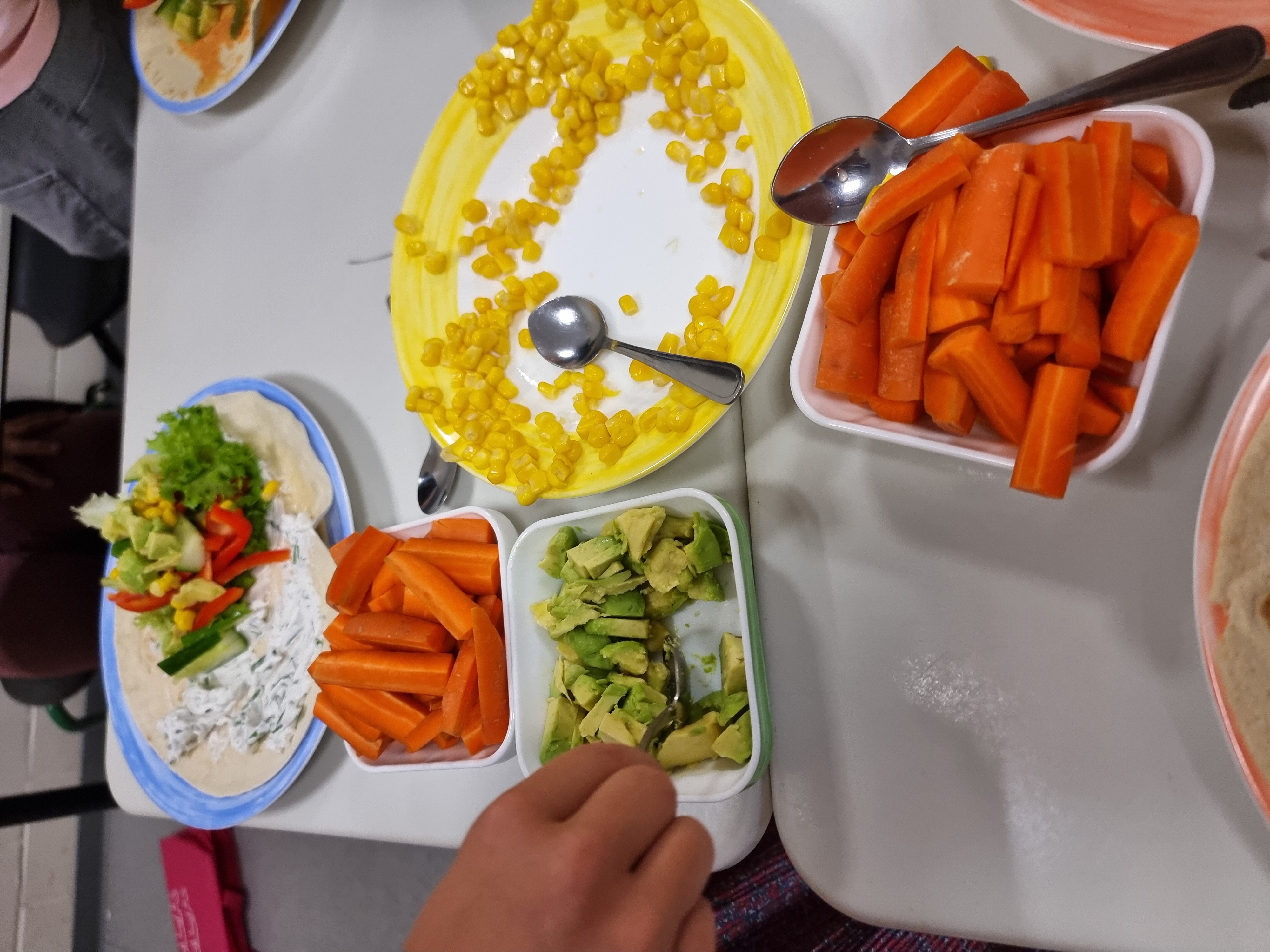 Fleischlos ist bunt und lecker - das zeigen mal wieder die Einblicke in die AG "Veggie-Crew". Die Schülerinnen und Schüler bereiteten bunte Gemüse-Wraps mit Hummus und Kräuter-Creme zu und alles ohne tierische Produkte.