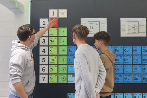 Seit Kurzem schmückt ein neues, eindrucksvolles Werk von über sechs Quadratmetern den Chemieraum und zieht damit viel Aufmerksamkeit auf sich. Doch nicht nur die Größe macht das neue Periodensystem der Schule zu etwas Besonderem: Es ist ein Unikat –handgefertigt, bis ins kleinste Detail durchdacht und randvoll mit pädagogischem Mehrwert.