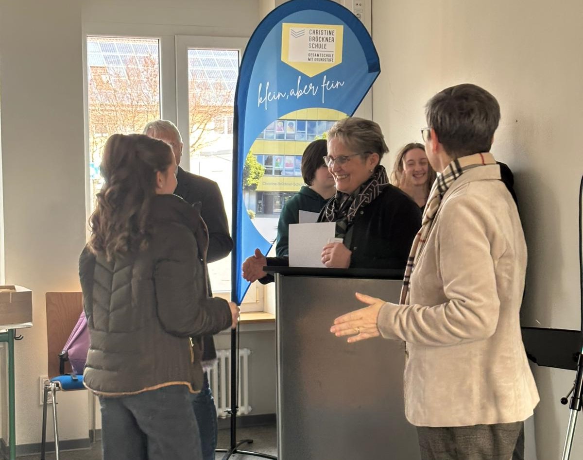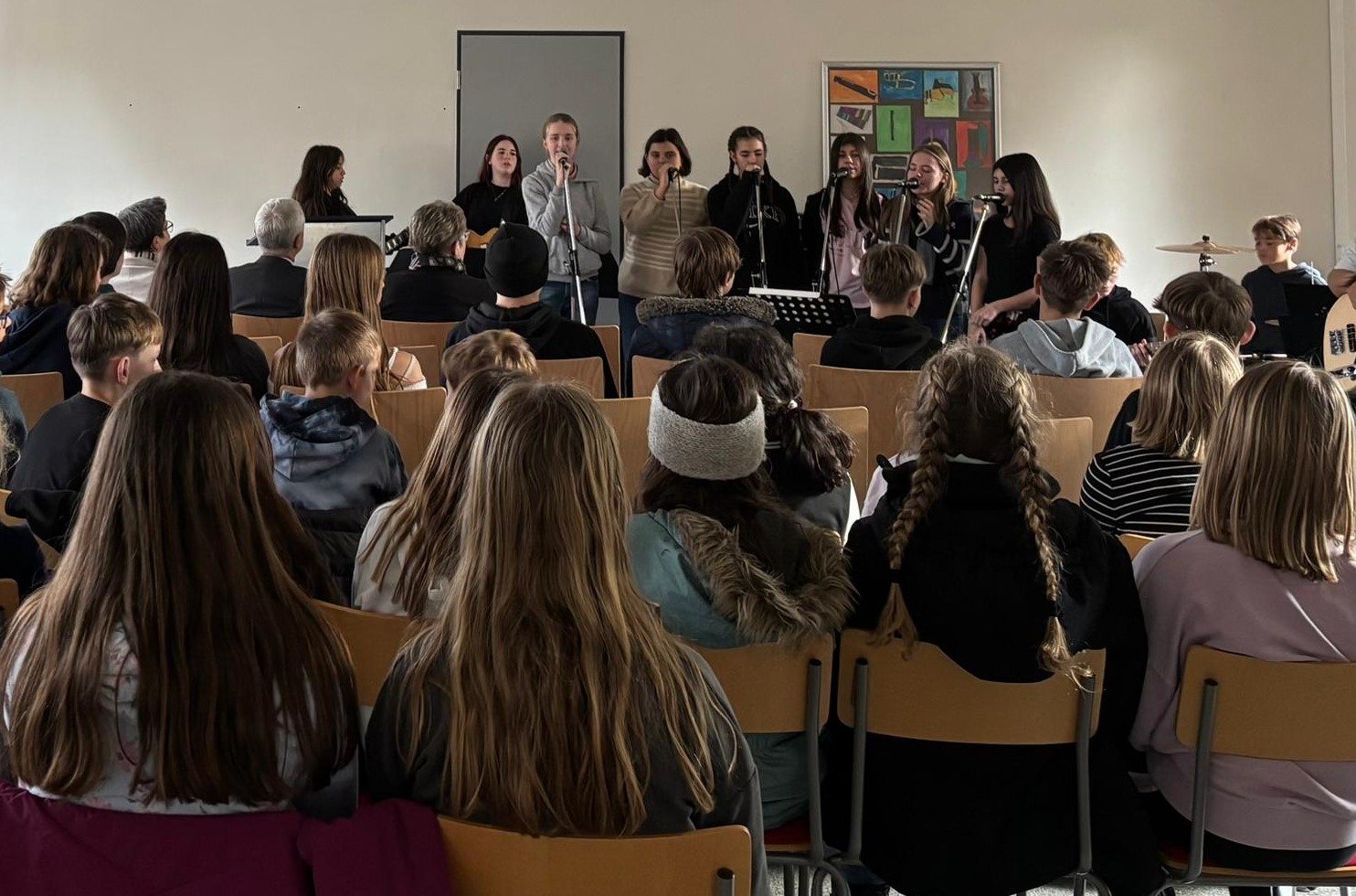 Am 27.11.2025 fand die diesjährige Zertifikatübergabe der neuen Busscouts statt. In Anwesenheit der stellvertretenden Schulleiterin Frau Behr, dem Fachbereichsleiter für Schulen, Sport und Mobilität beim Landkreis Kassel Herrn Koch und der Ansprechpartnerin für Fahrbegleiter bei der KVG Frau Schaumburg erhielten 8 Achtklässlerinnen und 8 Achtklässler ihre Zertifikate, mit denen sie offiziell zu ‚Busscouts‘ ausgezeichnet werden. Außer den Urkunden überreichte Herr Koch den Schülerinnen und Schülern als Anerkennung ihres bereits in mehrtätigen Seminaren gezeigten Engagements jeder / jedem eine Powerbank. Begleitet wurde die Veranstaltung durch zwei musikalische Beiträge der Schülerband unter der Leitung von Herrn Brüll. Als Zuschauer waren die Klassen 5G1 und 5A eingeladen. Im Rahmen der Ausbildung übten die Teilnehmer u.a. mithilfe spaßiger Rollenspiele, verschiedene Situationen im Bus souverän zu meistern und Konflikte oder Fehlverhalten sicher und angemessen anzusprechen, ohne dabei selbst in Gefahr zu geraten. Zudem wurden wichtige Sicherheitsaspekte vermittelt, insbesondere das richtige Verhalten im Notfall. Darüber hinaus erhielten sie spannende Einblicke in den Betriebshof Wilhelmshöher und lernten die Werkstatt, die Leitzentrale sowie das Straßenbahn-Cockpit kennen. Nun fühlen sich die neuen Busscouts motiviert und möchten zu einem sicheren Gefühl auf dem Schulweg beitragen. Wir wünschen ihnen viel Courage und Fingerspitzengefühl, damit sie in schwierigen Situationen an der Bushaltestelle oder im Bus das Richtige tun.
