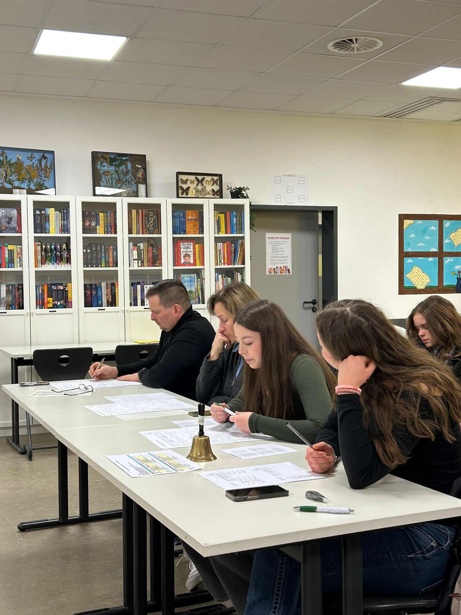 Von den Ergebnissen des intensiven Übens durfte sich gestern die Jury beim Schulfinale überzeugen. Die Klassenbesten der drei Jahrgänge debattieren beim Schulfinale gegeneinander. Es wurde in der ersten Runde die Frage "Sollen Schüler ihre Schule selbst putzen?" debattiert. In der zweiten Runde wurden die Debattierpartner gewechselt und es gab die letzte Möglichkeit Punkte bei der Frage "Soll es in Deutschland eine Führerscheinpflicht für E-Scooter geben?" zu holen.