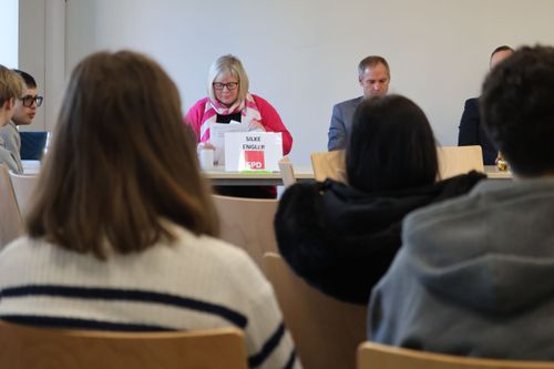 Silke Engler: Die Schuldezernentin und Vizelandrätin punktet mit Fachwissen – etwa bei den Investitionen in Schulsanierungen – und findet schnell einen Zugang. Den Fehlerquotienten lässt sie sich erklären (“Ich komme aus der DDR, bei uns ging es auch ohne“). Als es um KI geht, räumt sie ein, sie beim Redenschreiben zu nutzen, sagt aber auch: „Ich bin so alt, ich google noch.“ Das kommt an. Bei einer Stichprobe unserer Zeitung unter den Schülern wird der Auftritt der SPD-Politikerin am besten bewertet.