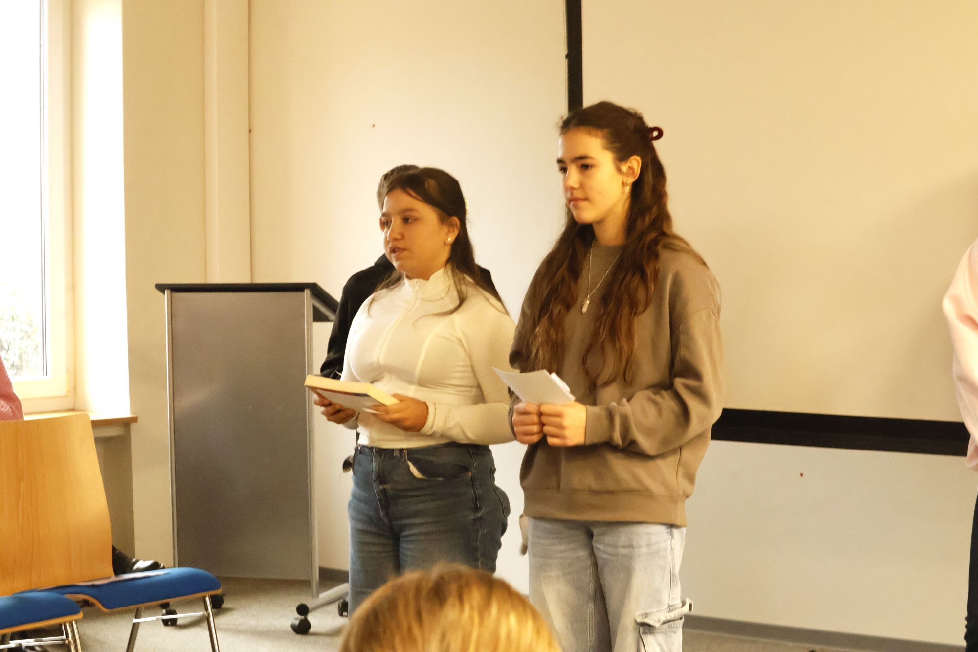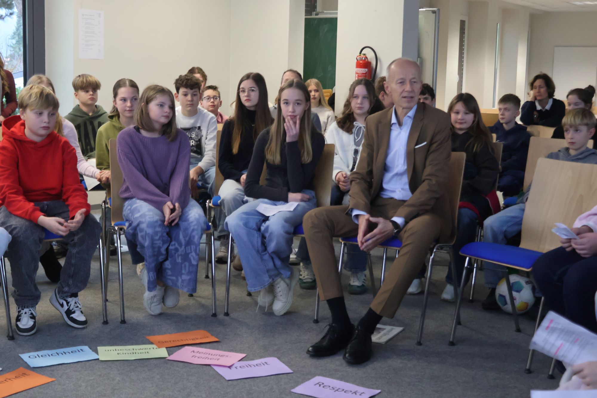 Anschließend setzte sich die Klasse 6G1 der Christine-Brückner-Schule mit Artikel 1 des Grundgesetzes auseinander. In einem kurzen Rollenspiel zum Buch „Als Hitler das rosa Kaninchen stahl“ veranschaulichten die Schülerinnen und Schüler, wie die Würde von Menschen verletzt wird. „Wir mussten aus Berlin nach Paris fliehen, das tat weh. Aber es war richtig, denn niemand verdient es, unter seiner Würde behandelt zu werden“, sagte ein Schüler in der Rolle von Alfred Kemper, dem Vater. Daran schloss sich die Frage an, ob die Werte des Kultusministers selbst schon einmal verletzt worden seien. „Natürlich habe ich mich schon unfair behandelt gefühlt“, antwortete Schwarz. Als Verletzung seiner persönlichen Werte würde er dies jedoch nicht bezeichnen. Er betonte stattdessen, dass Menschen auch heute noch aufgrund ihrer Herkunft oder Hautfarbe benachteiligt würden, was vollkommen inakzeptabel sei.